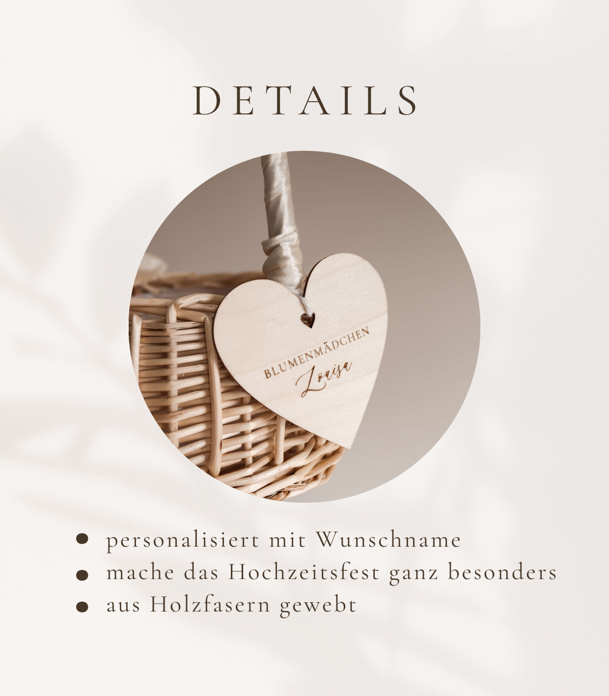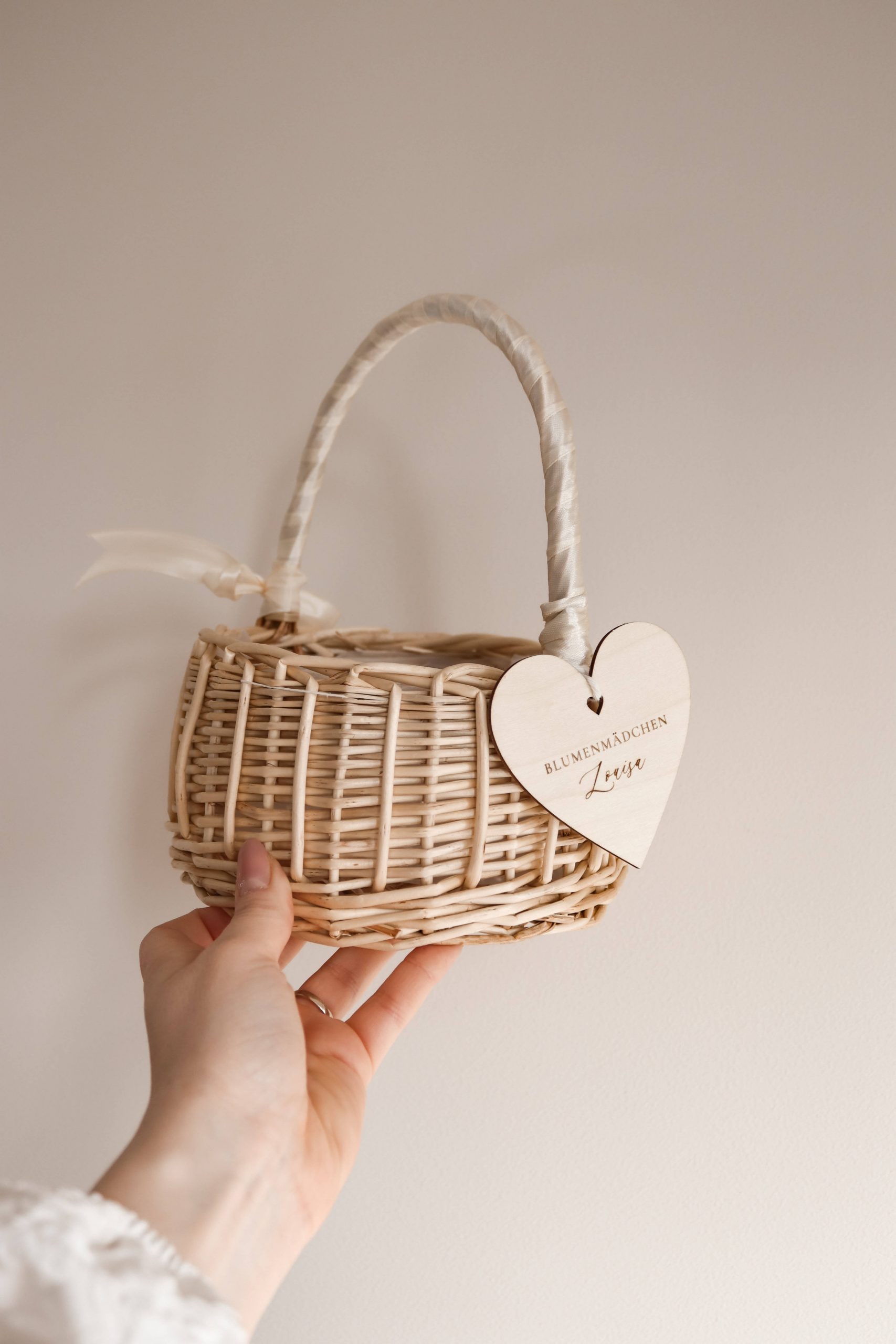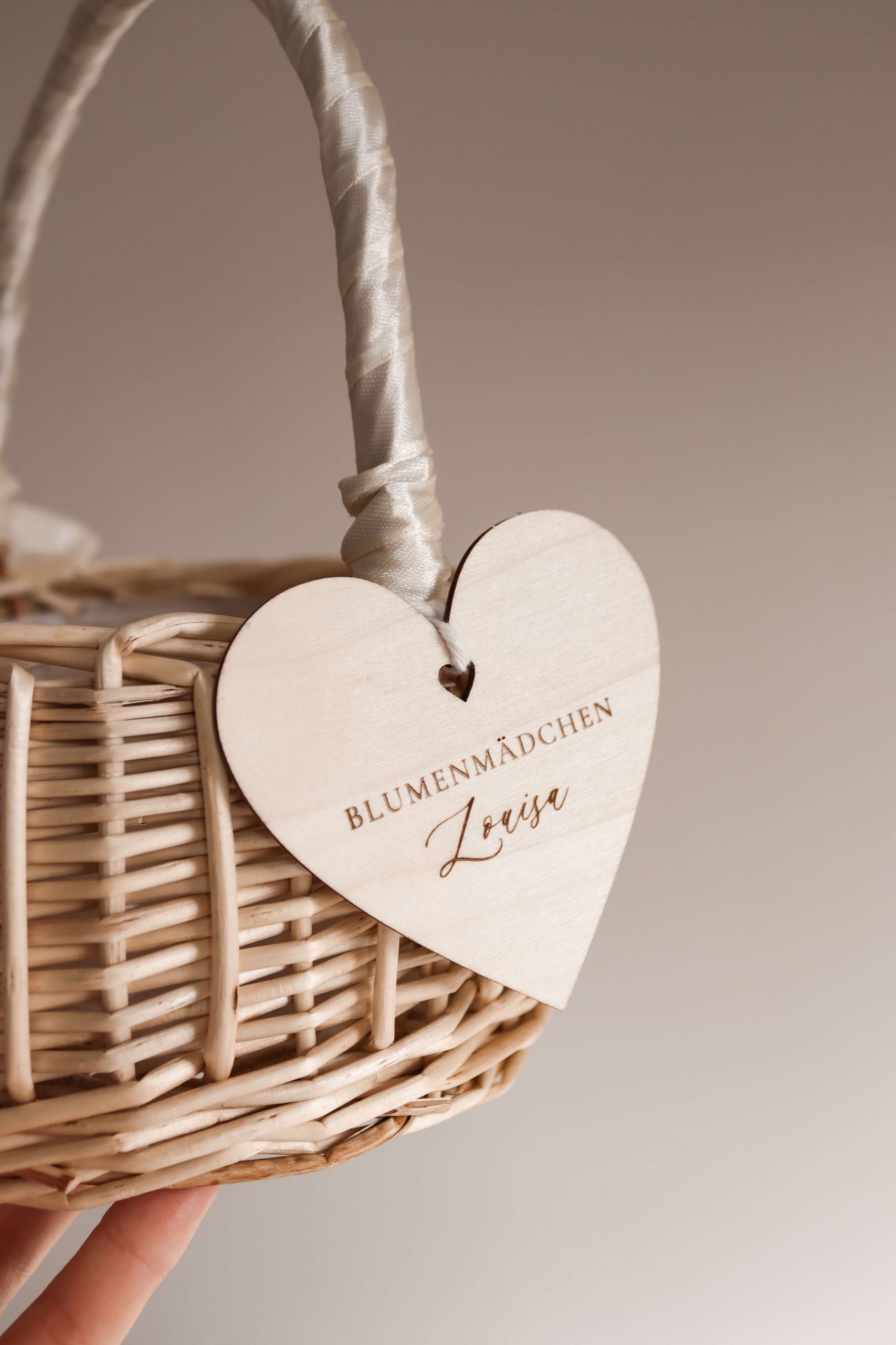 Das Besondere an diesem Körbchen ist der personalisierte Anhänger in Herzform aus Holz, der mit dem Namen des Blumenmädchens graviert wird. Dadurch wird das Körbchen zu einem ganz persönlichen Detail der Hochzeit und gleichzeitig zu einer wunderschönen Erinnerung an diesen besonderen Tag.
