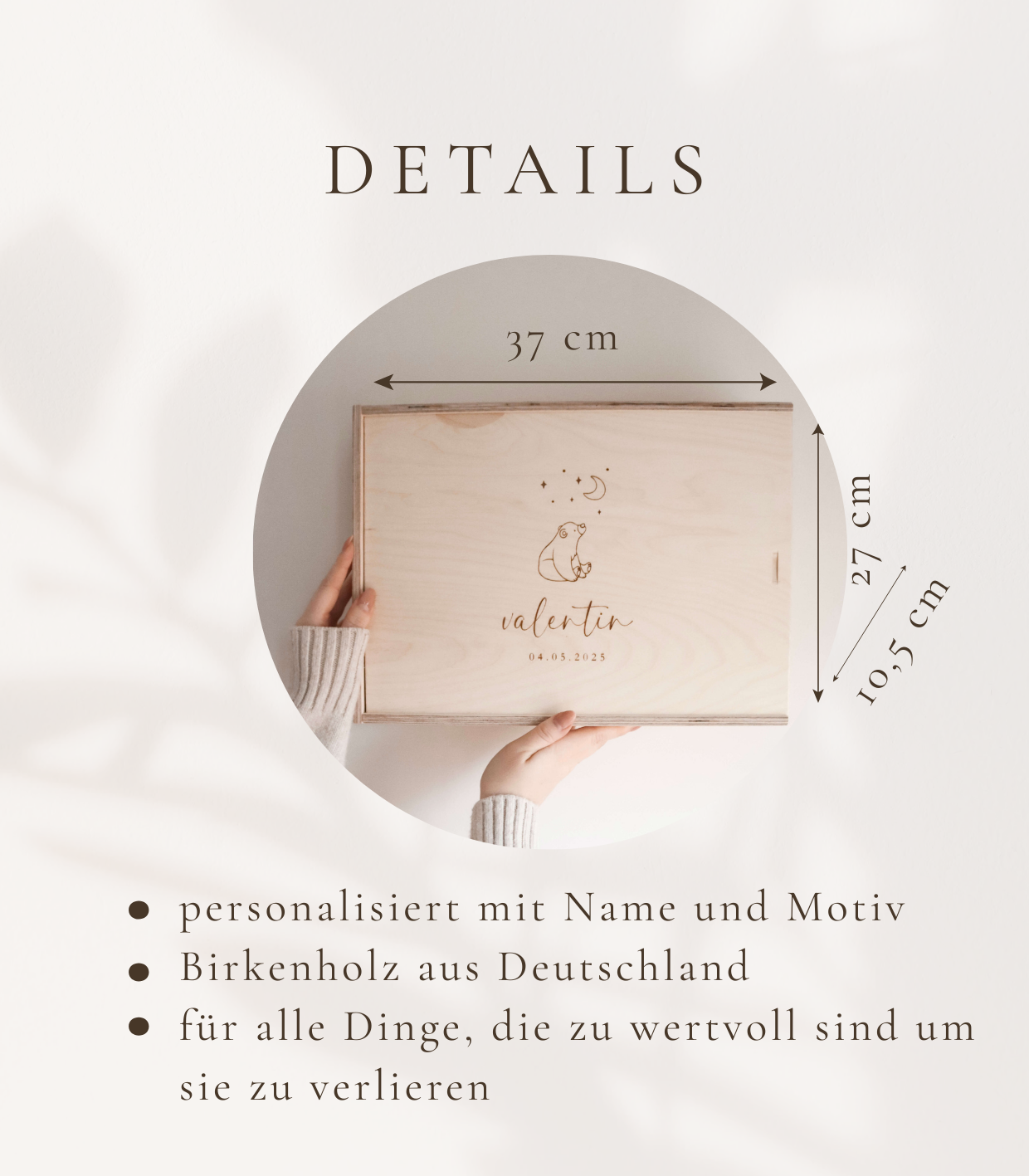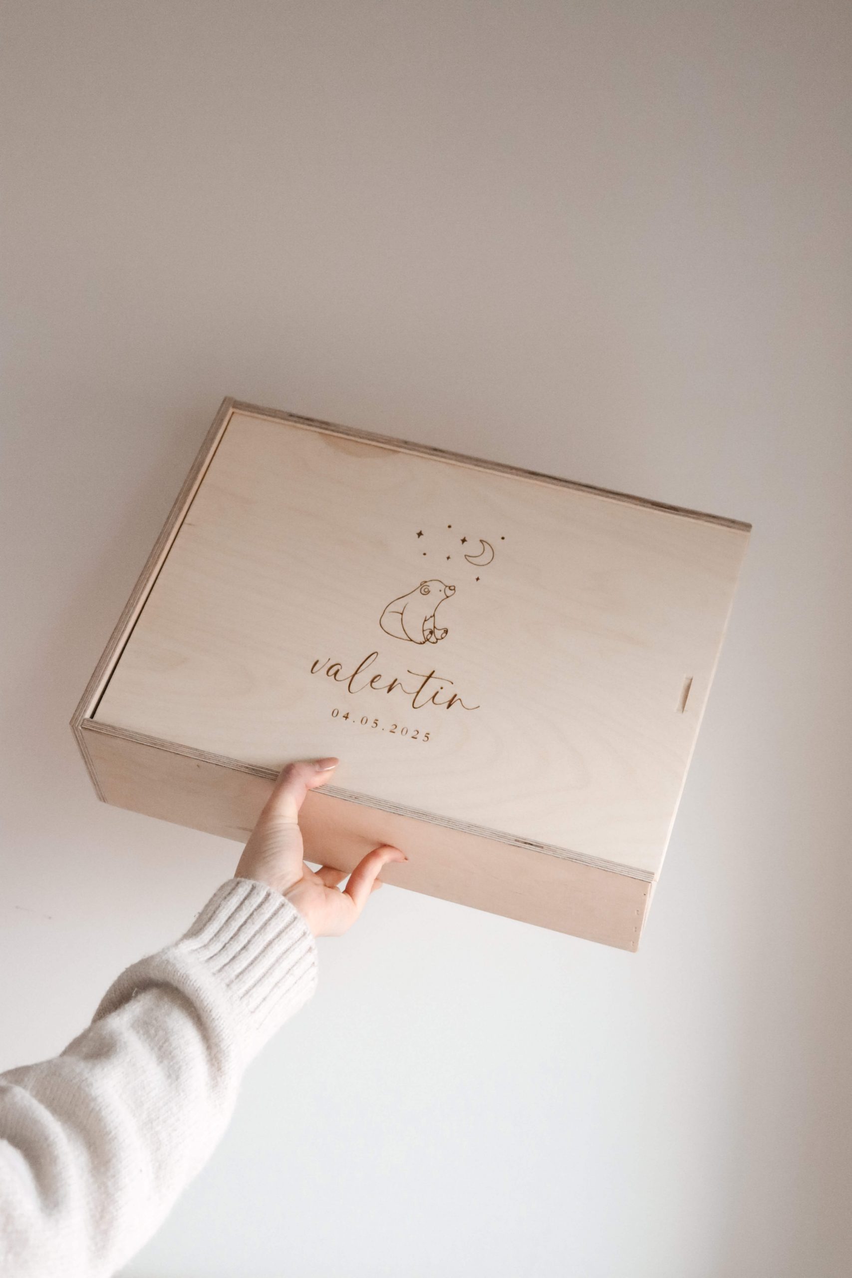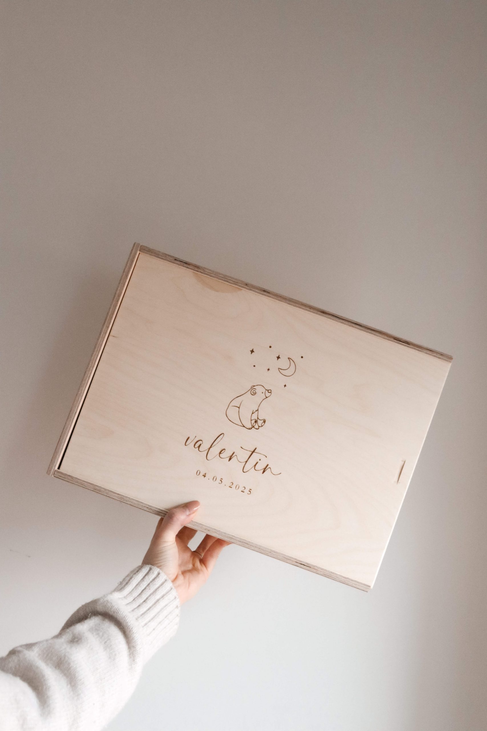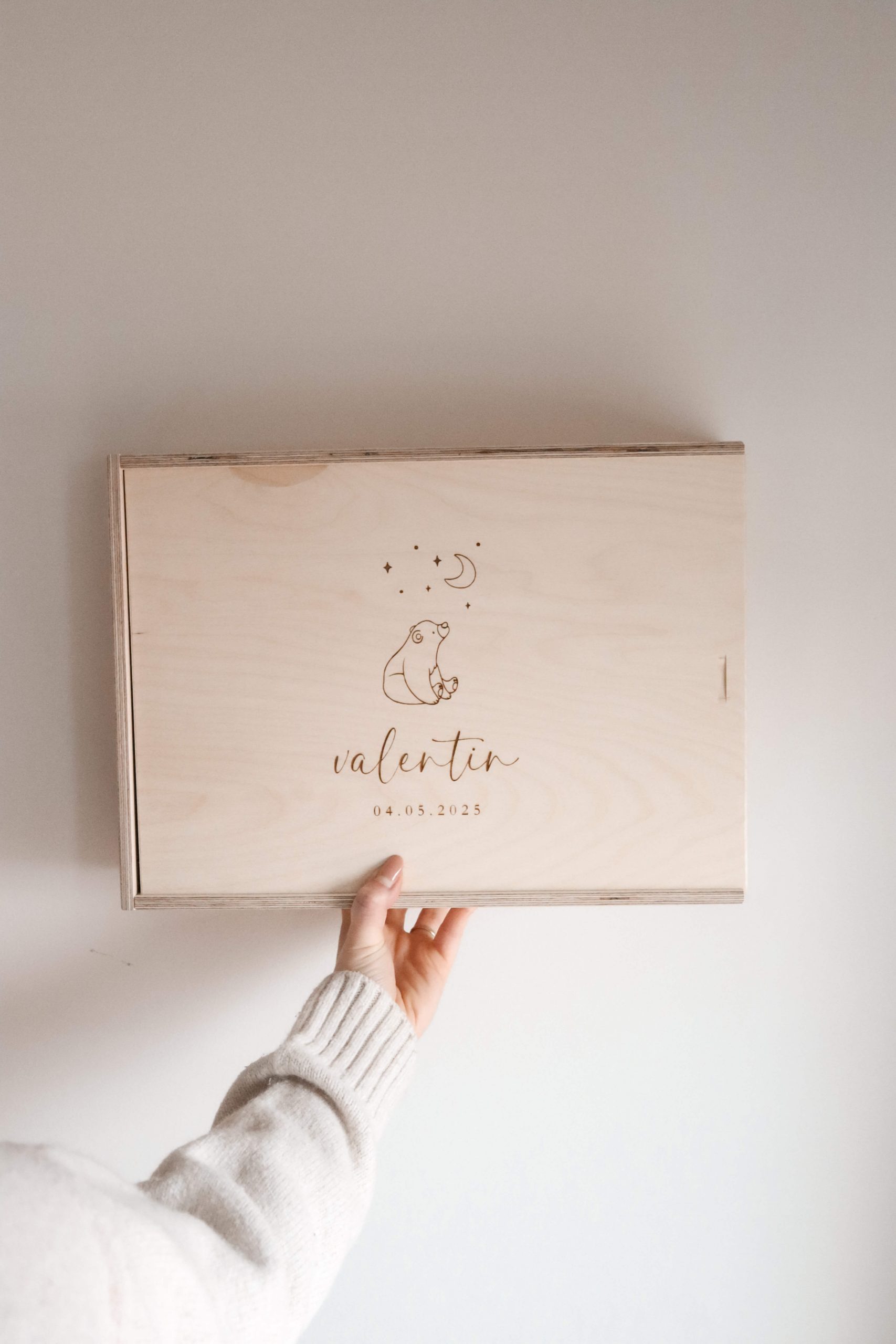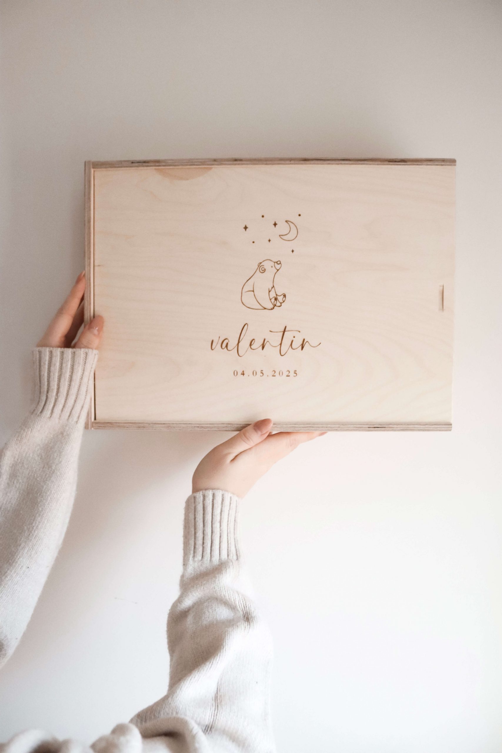 Die Kiste wird individuell mit dem Namen des Kindes und einem zarten Bärenmotiv personalisiert. Zurückhaltend im Stil, aber voller Bedeutung – ideal, um die Entwicklung deines Kindes von Anfang an zu begleiten.