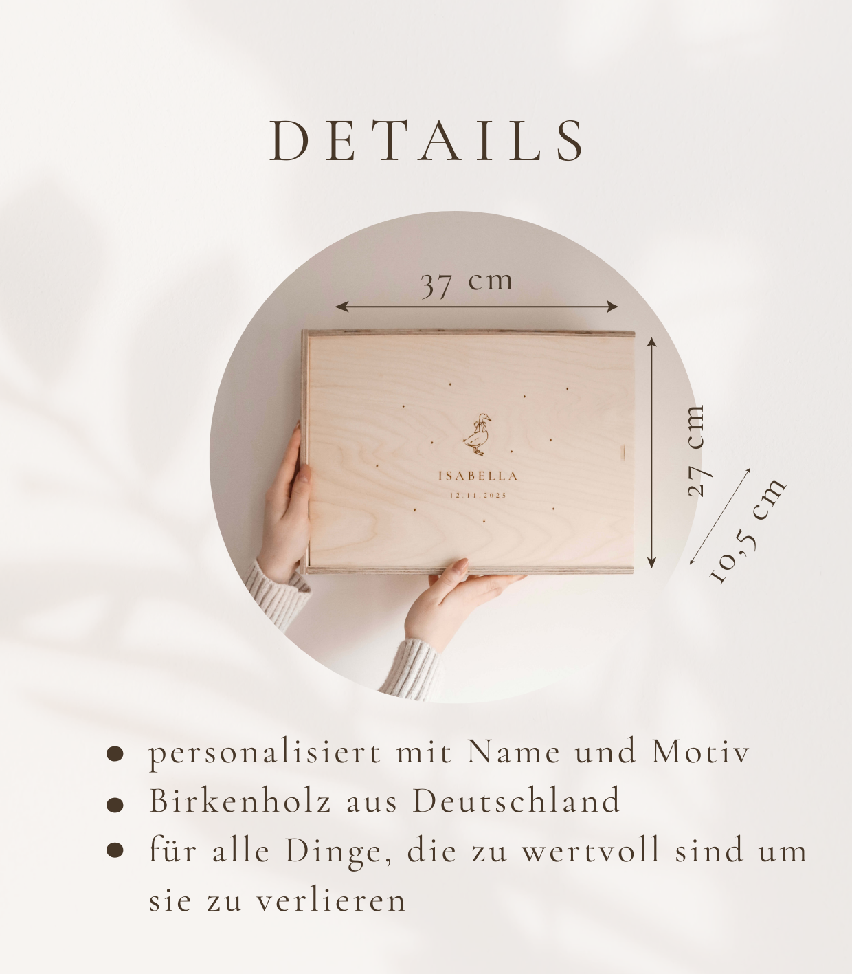 Die Kiste wird individuell mit dem Namen des Kindes und einem zarten Gansmotiv personalisiert. Zurückhaltend im Stil, aber voller Bedeutung – ideal, um die Entwicklung deines Kindes von Anfang an zu begleiten.