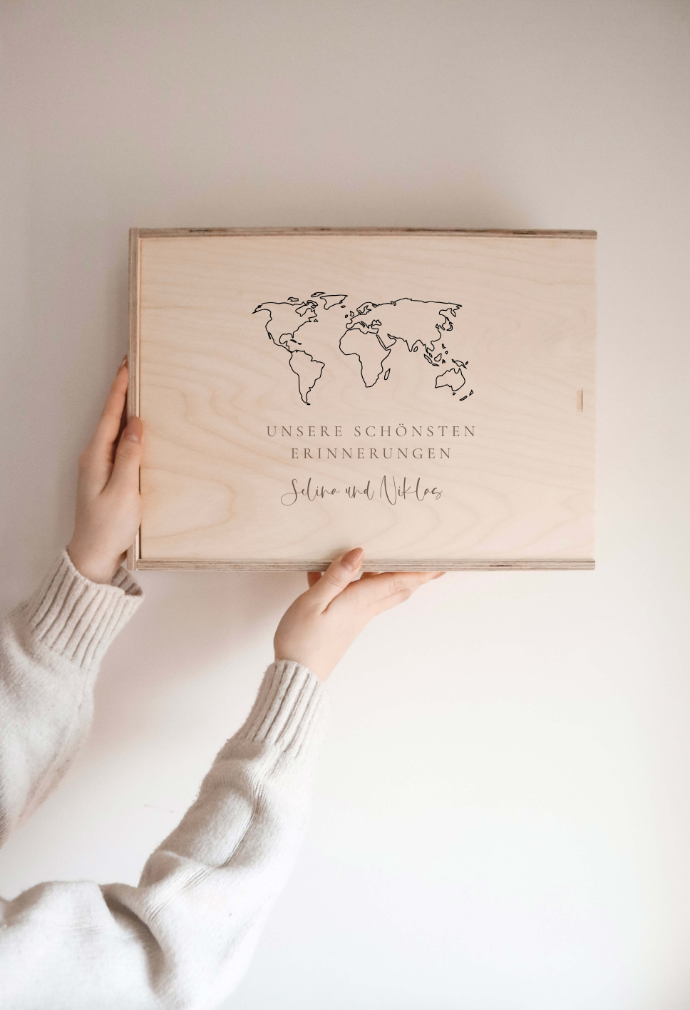 Die Kiste wird individuell mit dem Namen und einer Weltkarte personalisiert. Zurückhaltend im Stil, aber voller Bedeutung – ideal, um die schönsten Erinnerungen an besondere Reisen an einem Ort zu halten.