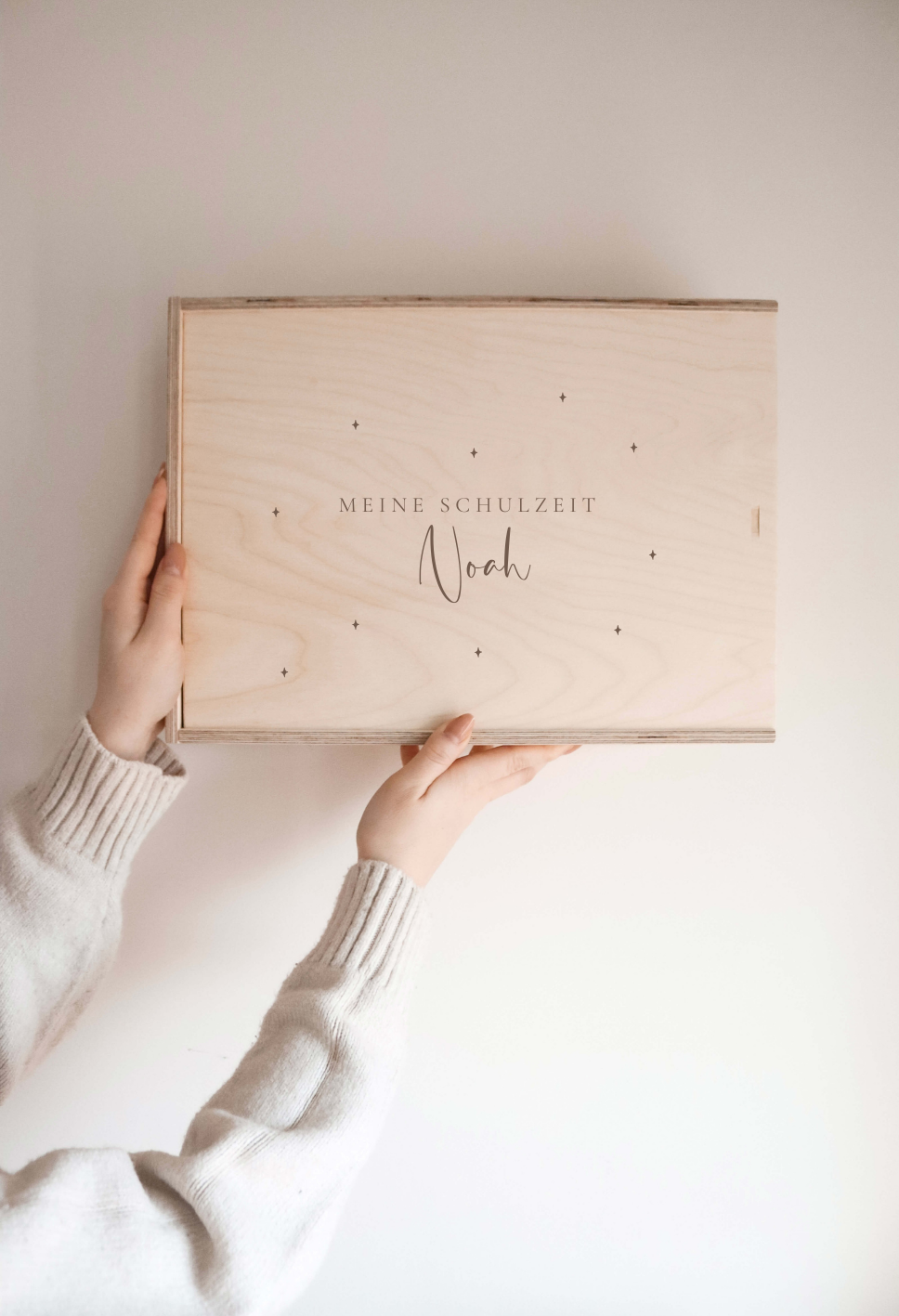 Die Kiste wird individuell mit dem Namen des Kindes personalisiert. Zurückhaltend im Stil, aber voller Bedeutung – ideal, um die Erinnerungen an die Schulzeit an einem Ort zu halten.