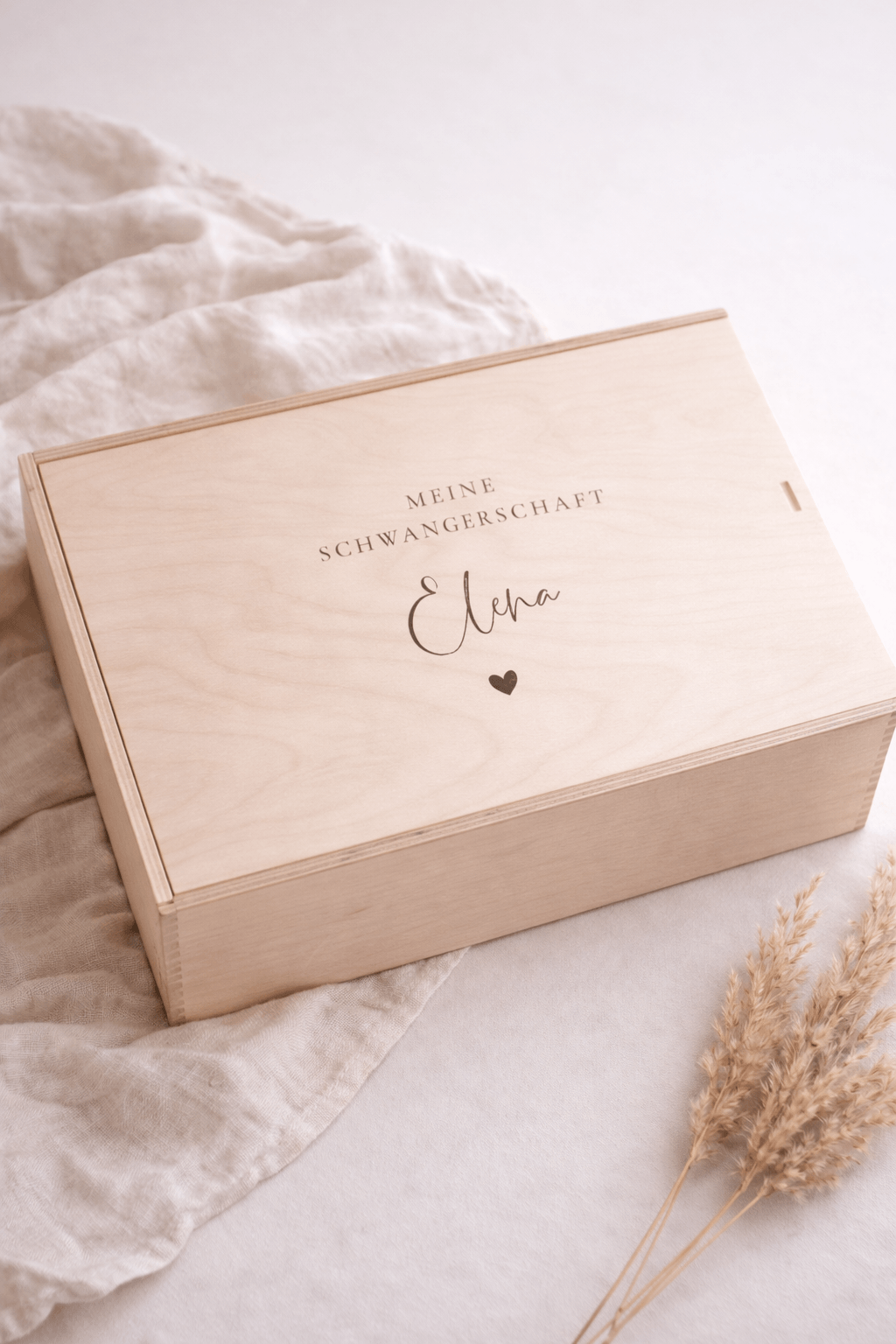 Die Kiste wird individuell mit dem Namen und Herz personalisiert. Zurückhaltend im Stil, aber voller Bedeutung – ideal, um die Entwicklung Schwangerschaft von Anfang an zu begleiten.