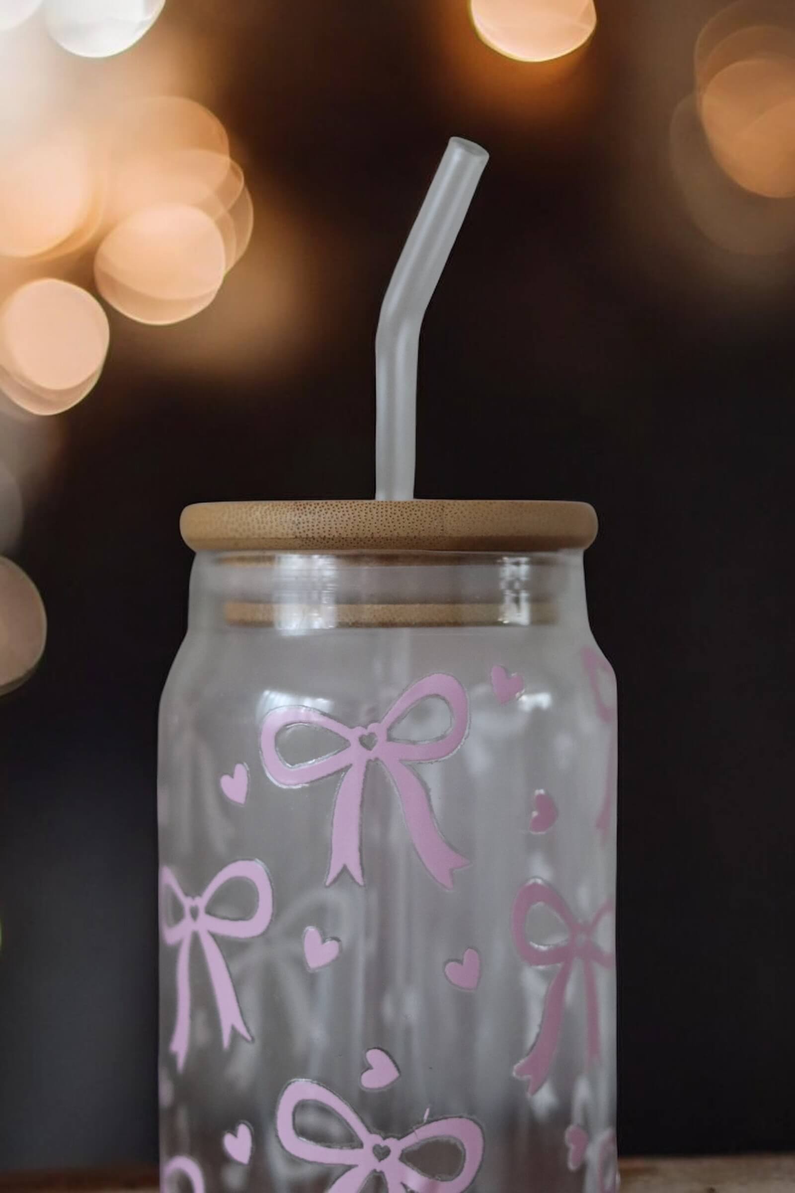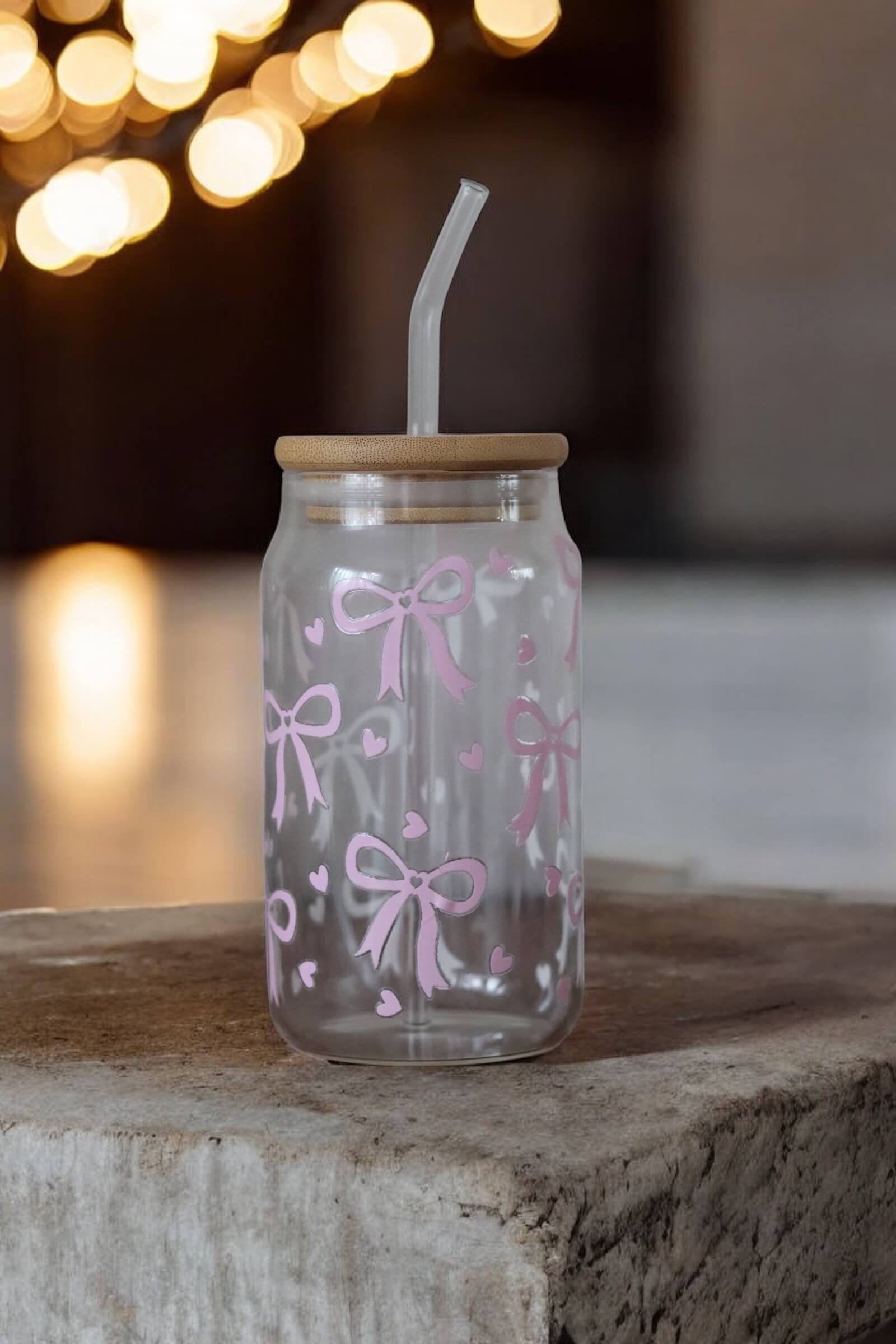 Sommerfeeling im Glas – Trinkglas mit Bambusdeckel, Glasstrohhalm & Muster aus rosa Schleifen und Herzen