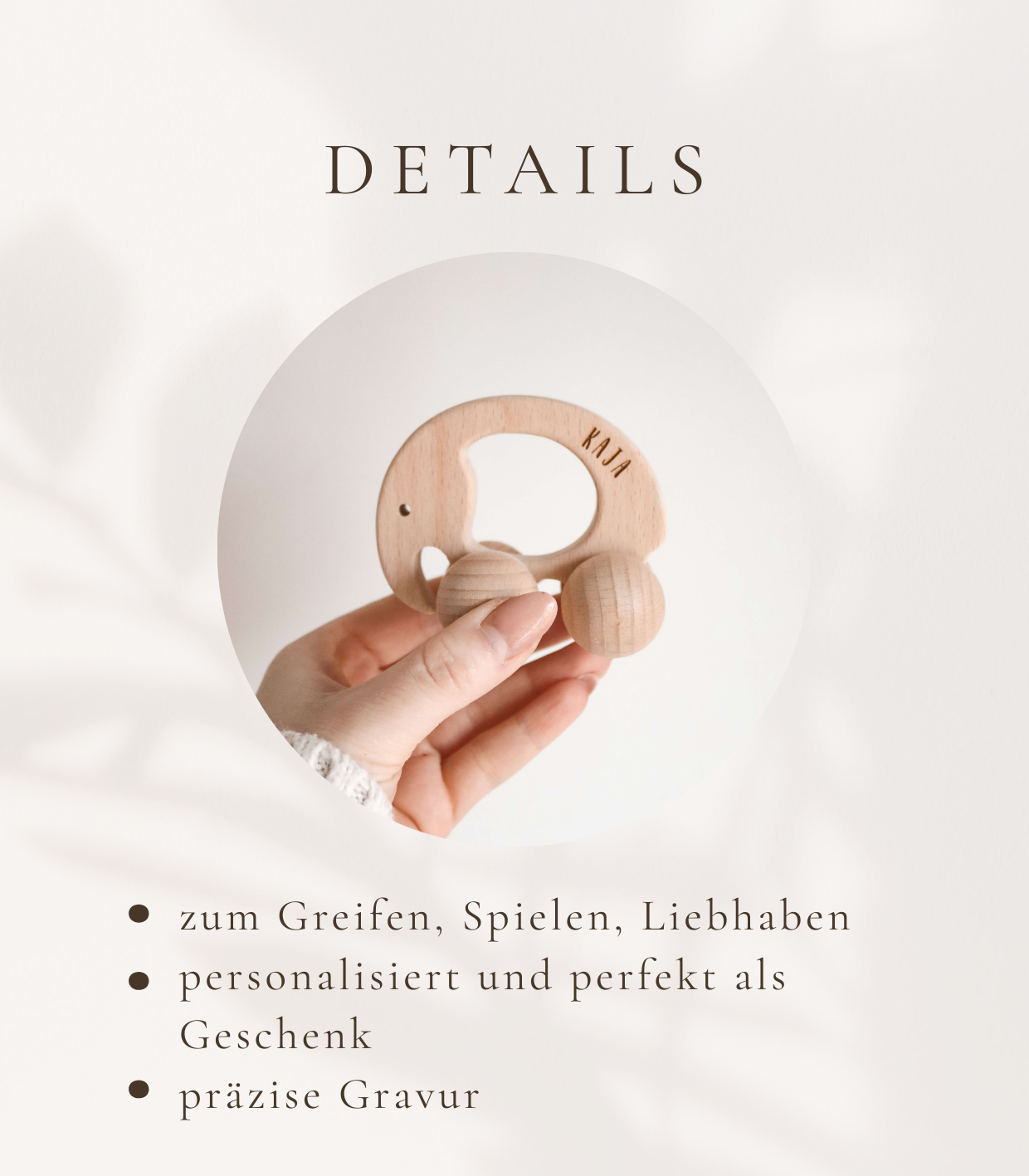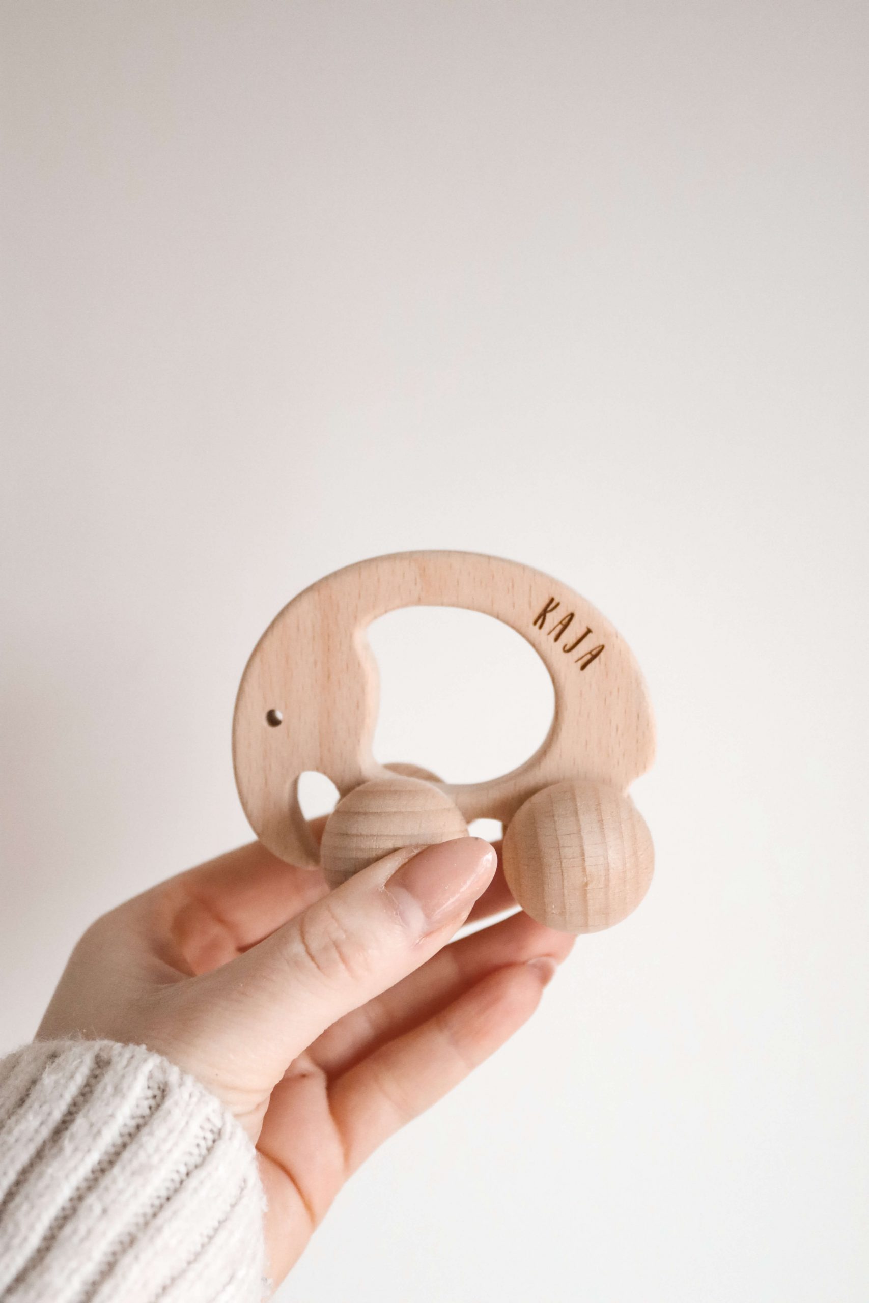 Der handgefertigte Greifling aus hochwertigem Holz verbindet robustes Spielzeug mit zarter Personalisierung – wähle zwischen süßen Motiven wie Auto, Elefant, Dino oder Igel, kombiniert mit dem Namen deines Kindes, fein laserggraviert direkt ins Holz.