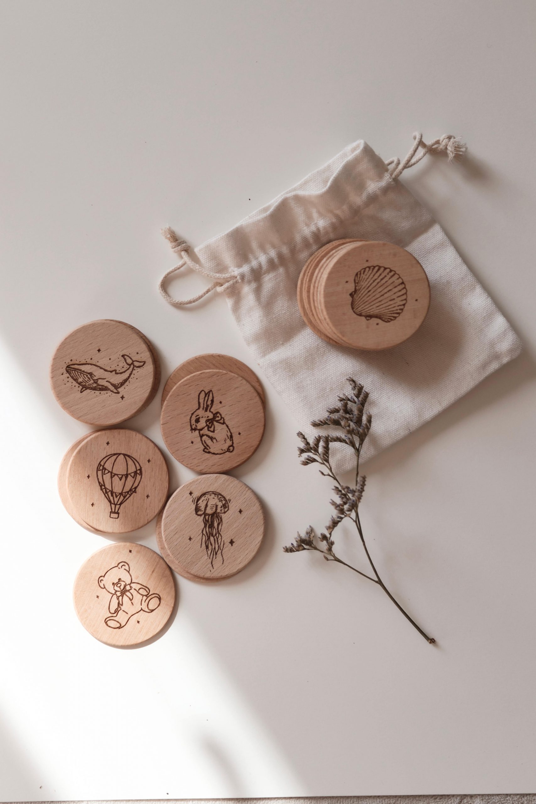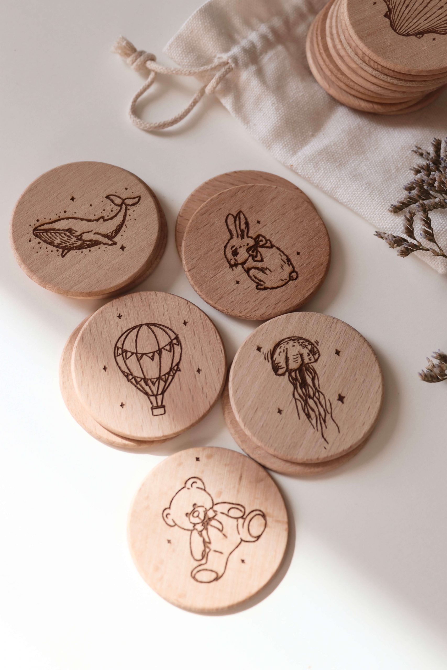 • Gesamtteile: 20 Holzscheiben im Baumwollbeutel