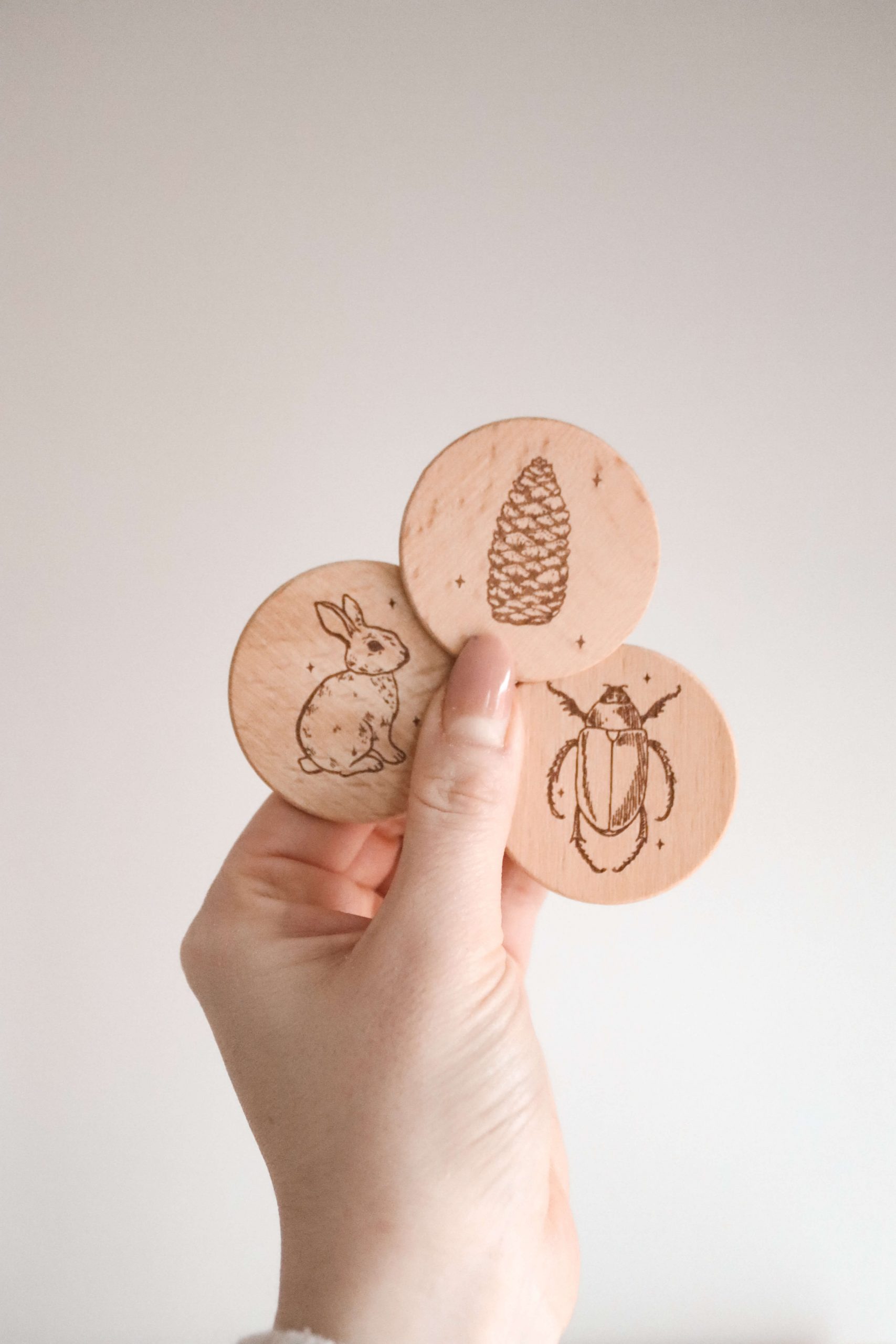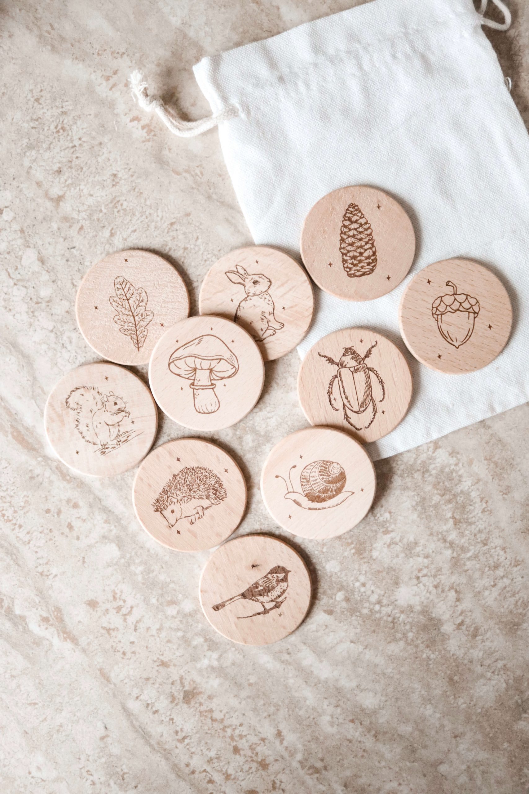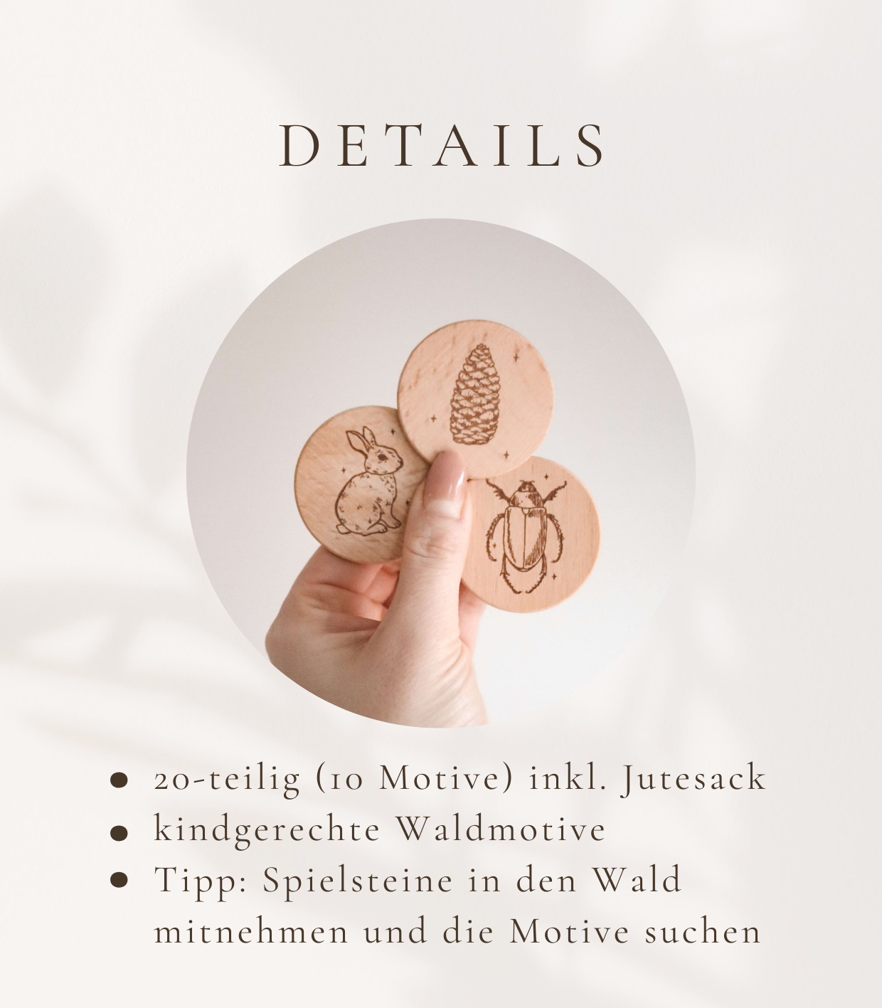 Nehmt die Spielsteine mit zum Spaziergang in den Wald und lasst eure Kleinen den Wald spielerisch entdecken und nach den Motiven suchen.