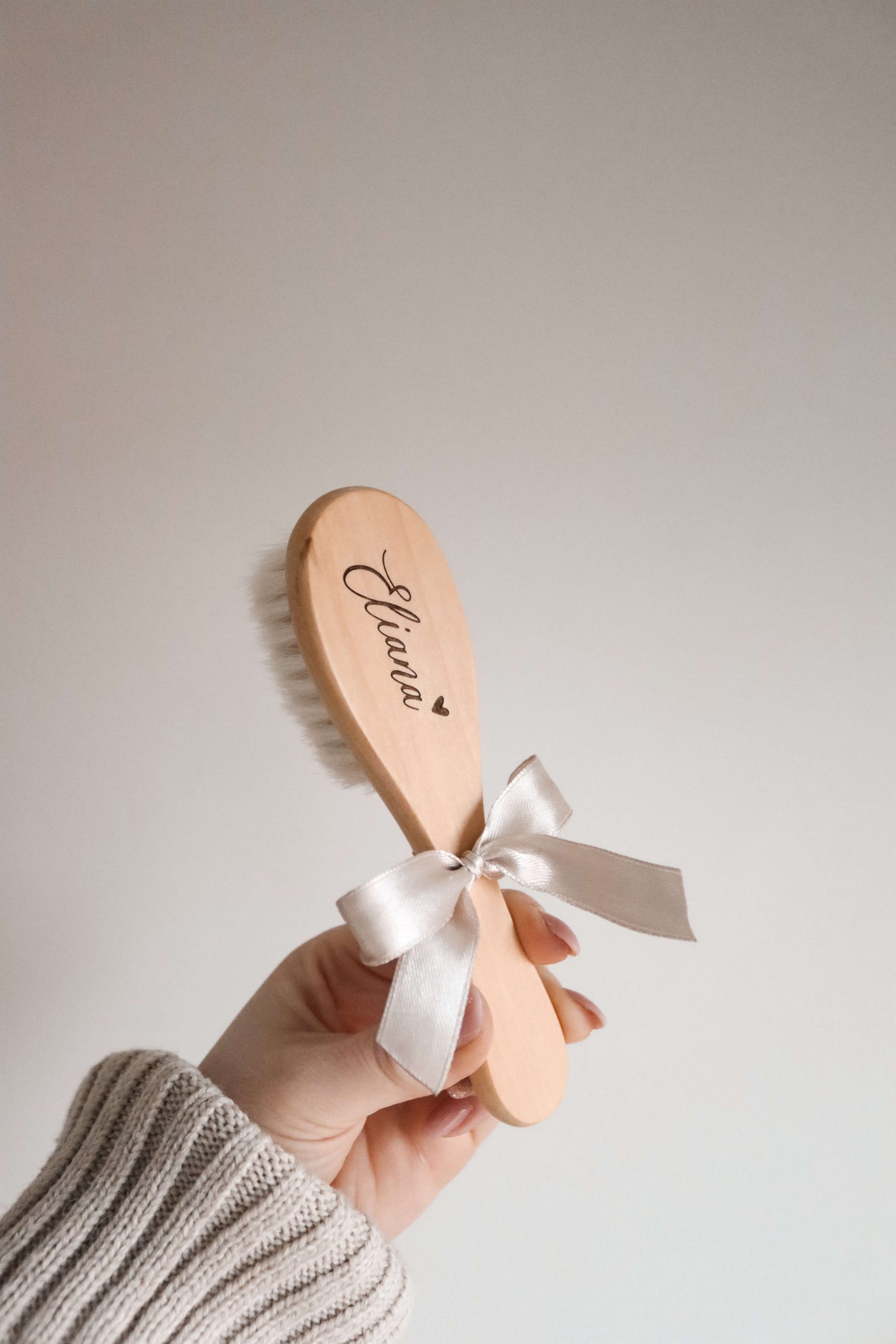 Jede personalisierte Babyhaarbürste wird individuell mit deinem gewünschten Namen und einem kleinen Herz versehen. Die präzise Gravur macht jede Bürste zu einem Unikat – persönlich, zeitlos und emotional.