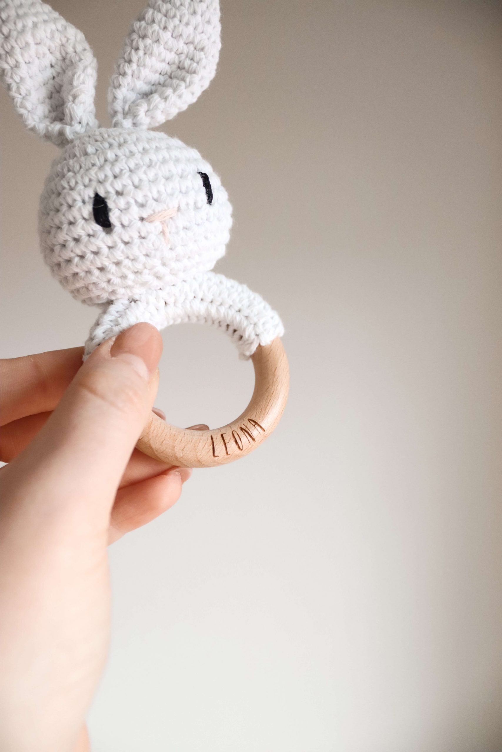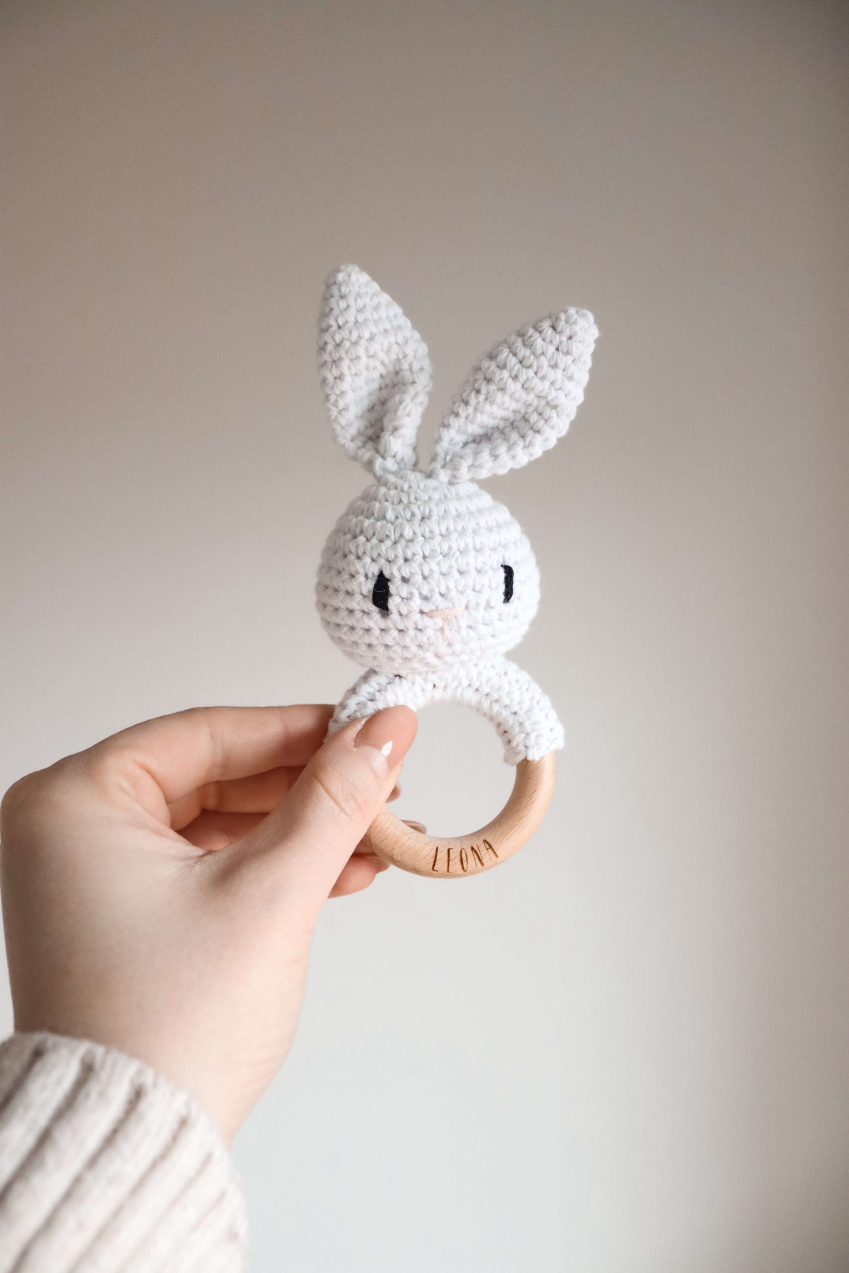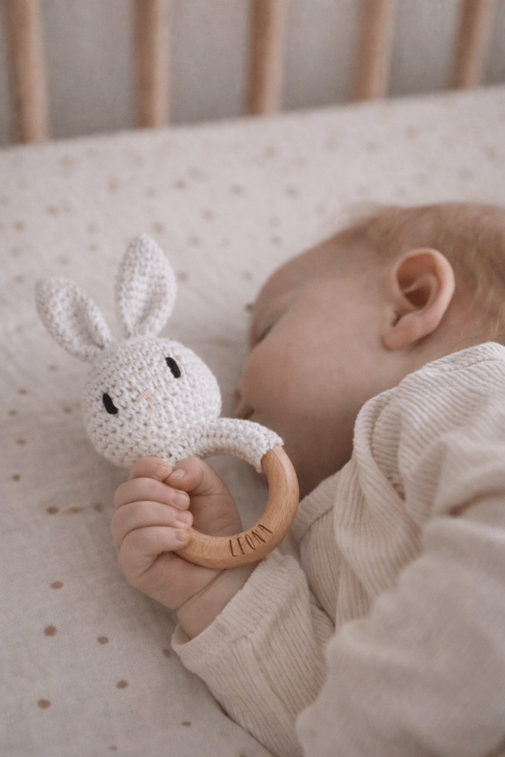 Die handgehäkelte Babyrassel in Hasenform vereint Baumwolle mit nachhaltigem Holz und deiner Wunsch-Gravur – ein perfektes Geschenk zur Geburt oder Taufe.