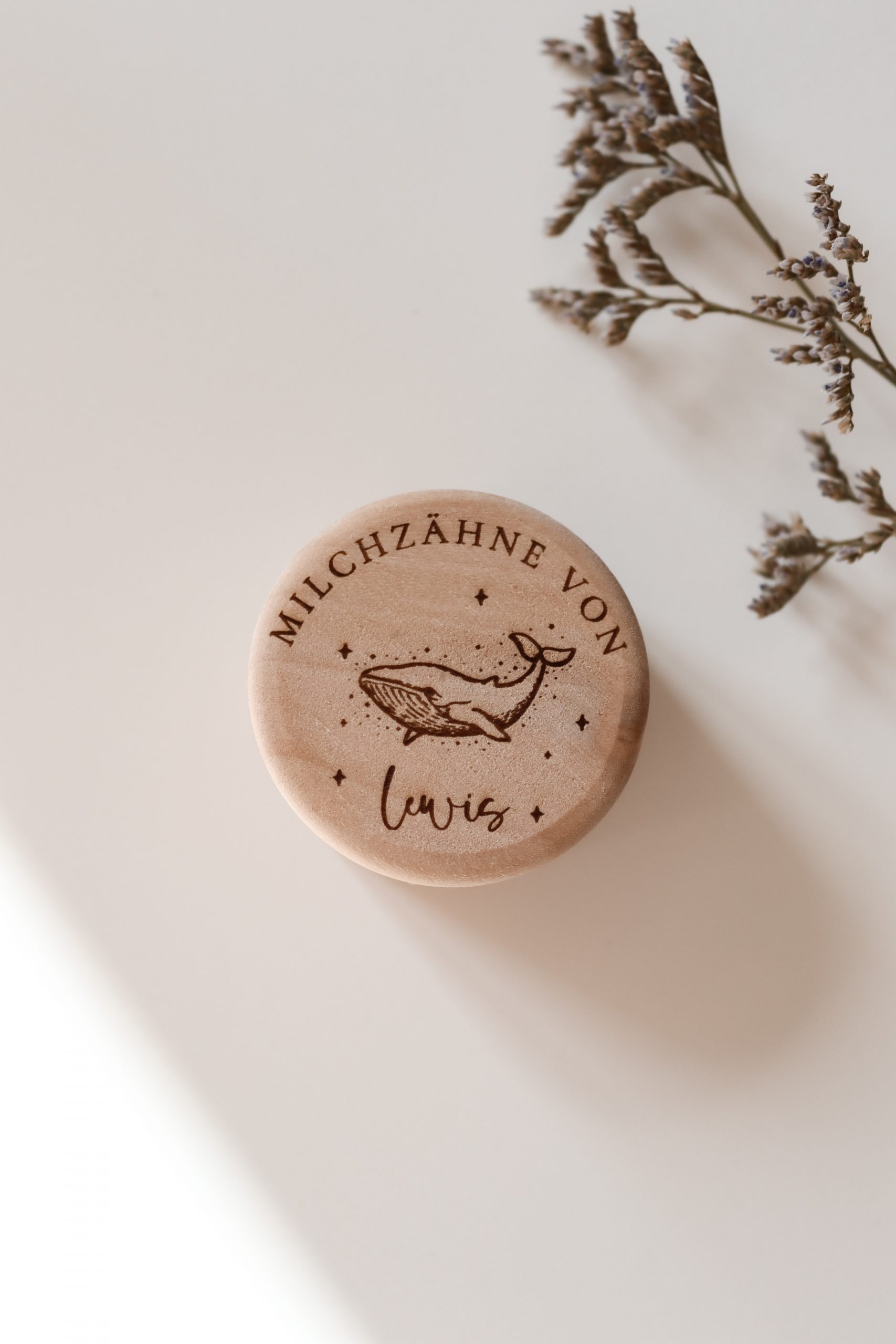 Mit dem zarten Wal-Motiv und der individuellen Namensgravur wird jede Dose zu einem ganz persönlichen Unikat. Klein, handlich und perfekt, um Milchzähne über viele Jahre hinweg aufzubewahren.