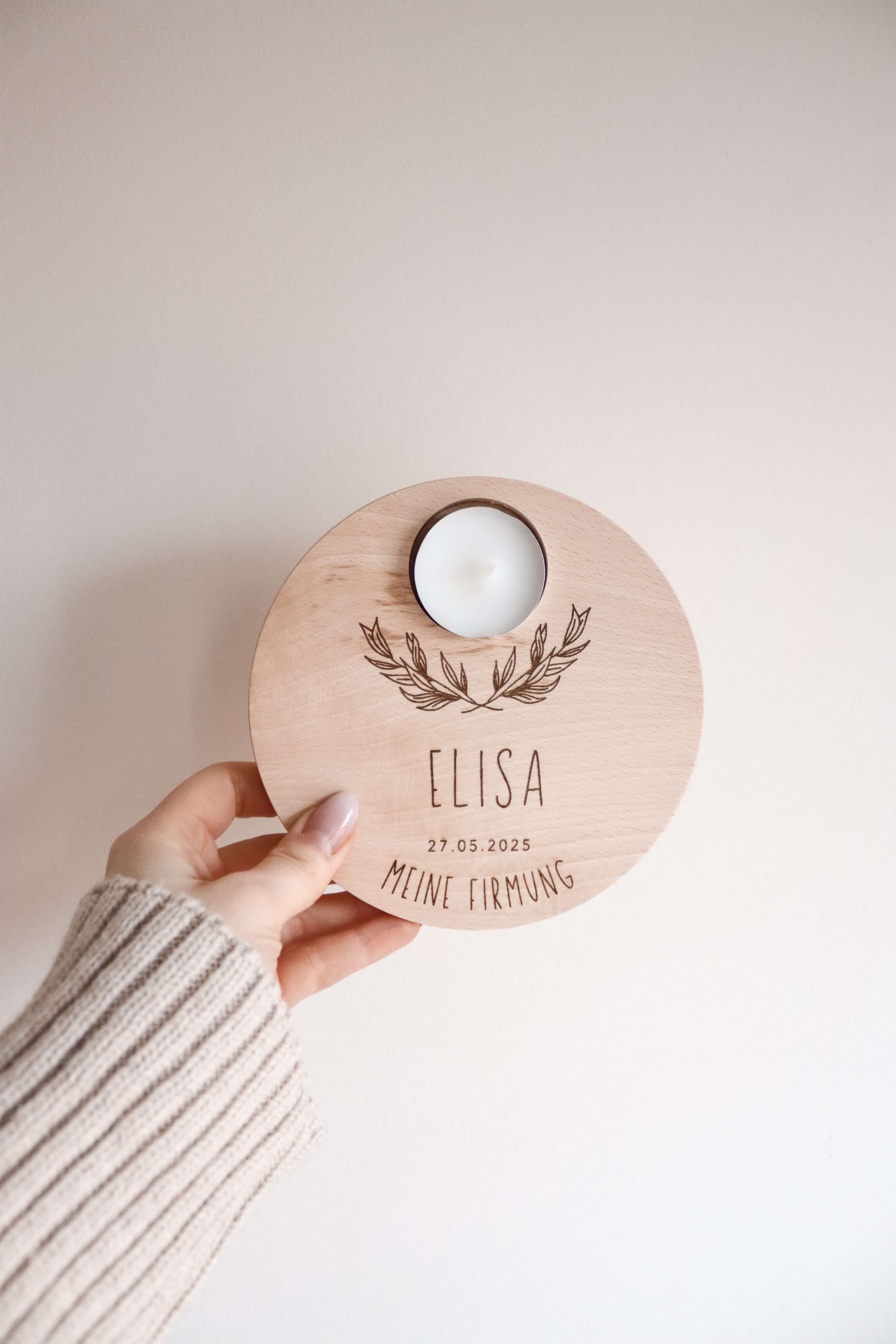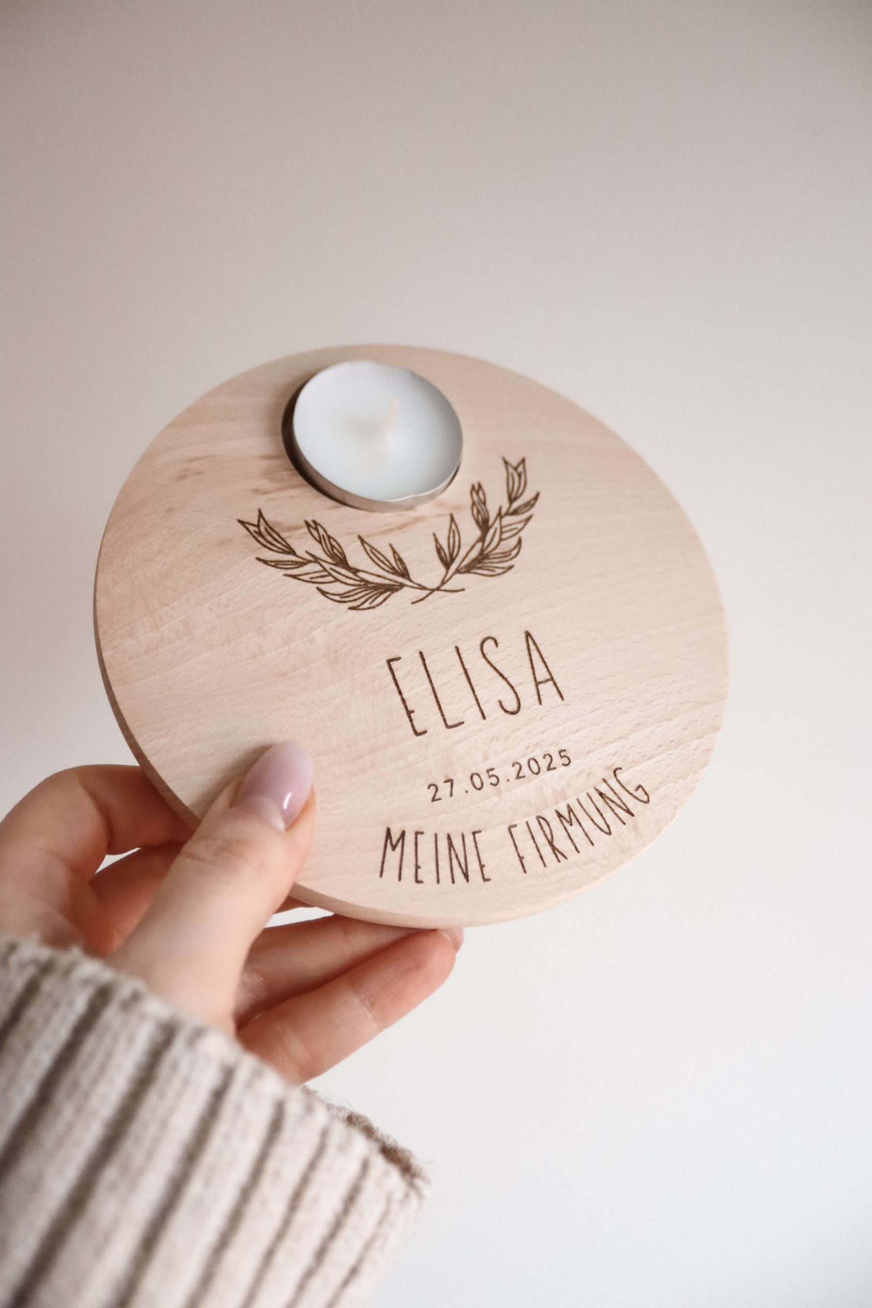 Dieses personalisierte Geschenk zur Firmung ist ein liebevolles und zeitloses Erinnerungsstück an einen ganz besonderen Tag. Das Set besteht aus einem runden Holzteller aus Buchenholz und einem passenden Teelichthalter und verbindet Natürlichkeit mit schlichter Eleganz.