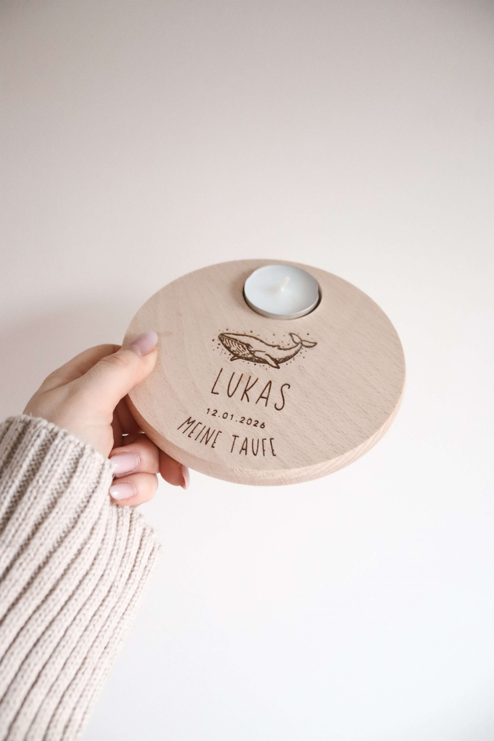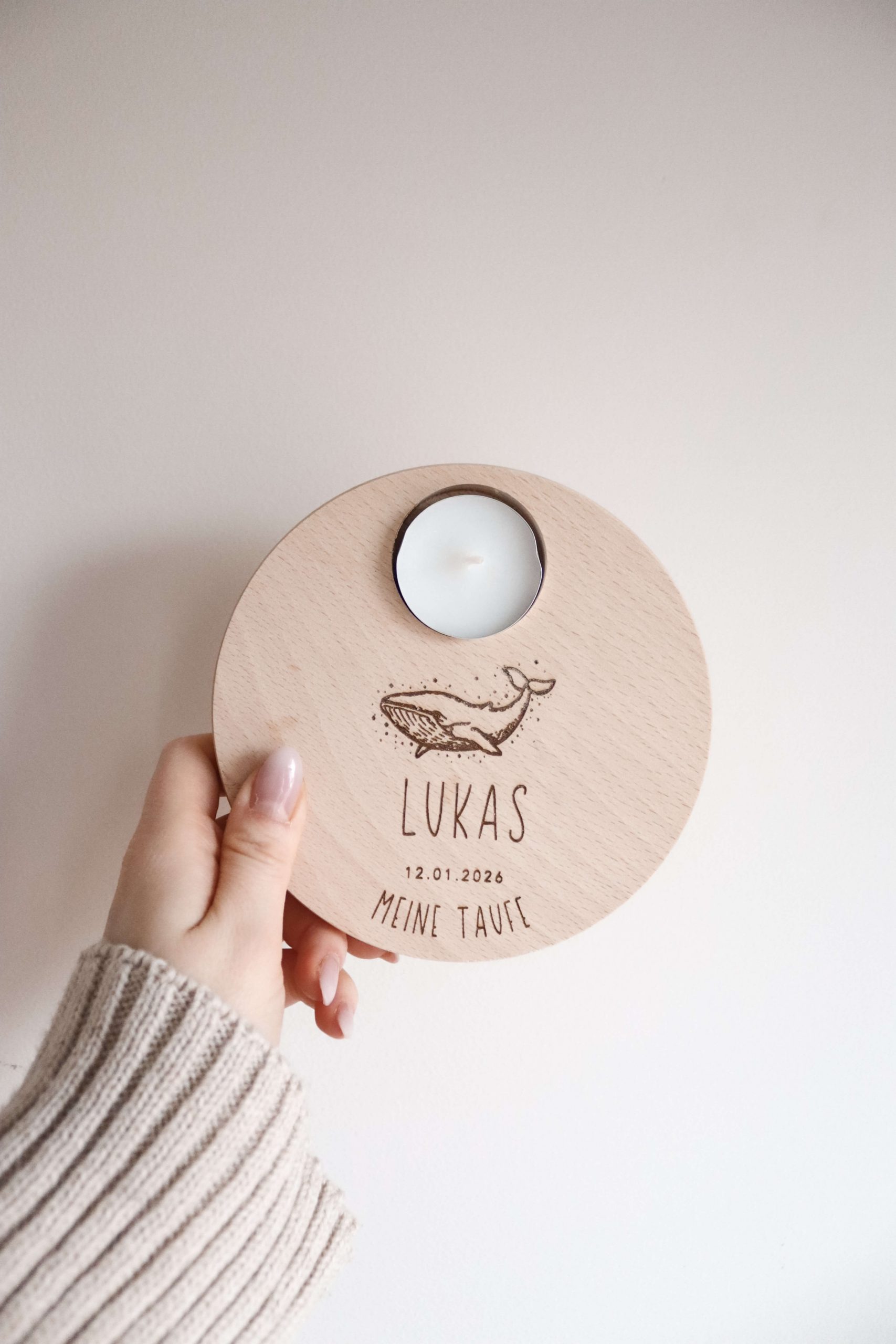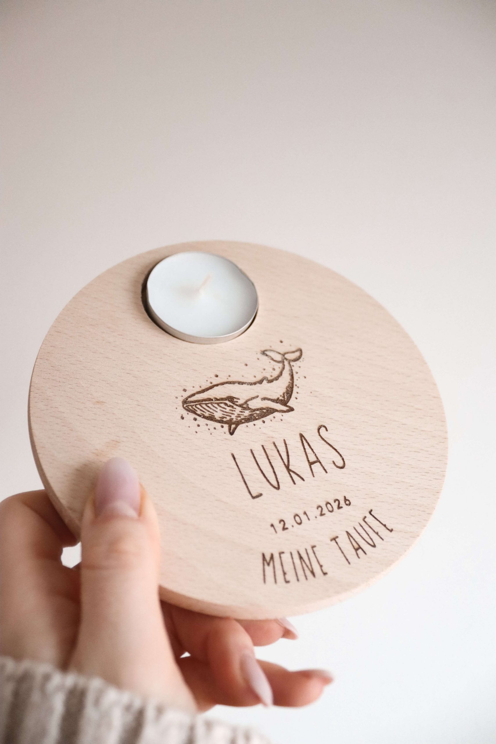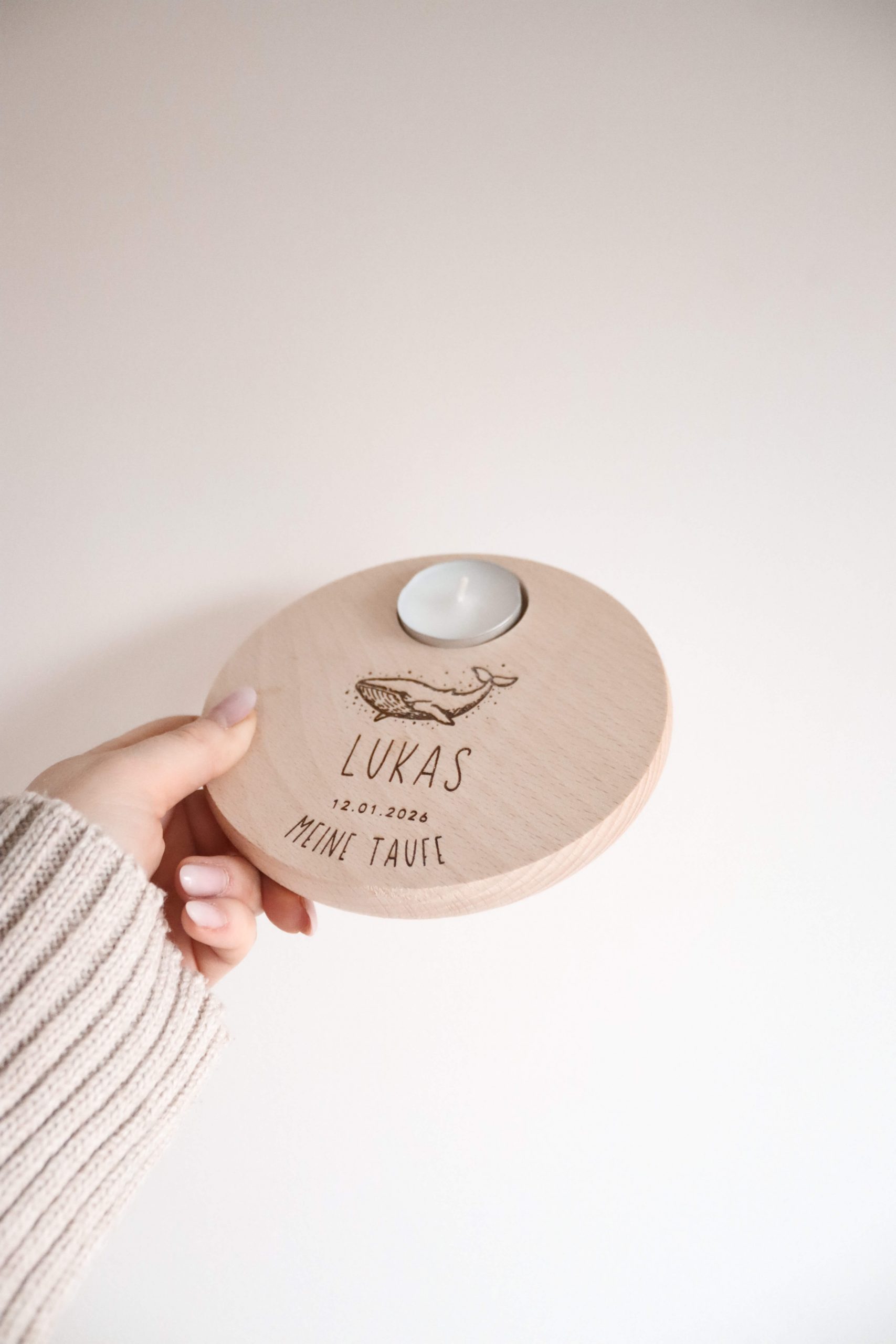 Dieses personalisierte Geschenk zur Taufe ist ein liebevolles und zeitloses Erinnerungsstück an einen ganz besonderen Tag. Das Set besteht aus einem runden Holzteller aus Buchenholz und einem passenden Teelichthalter und verbindet Natürlichkeit mit schlichter Eleganz.