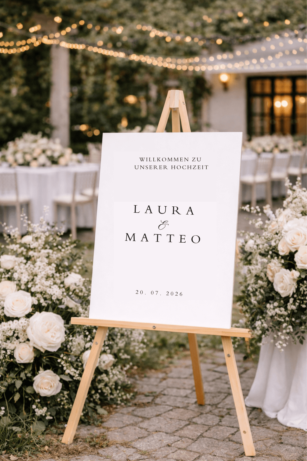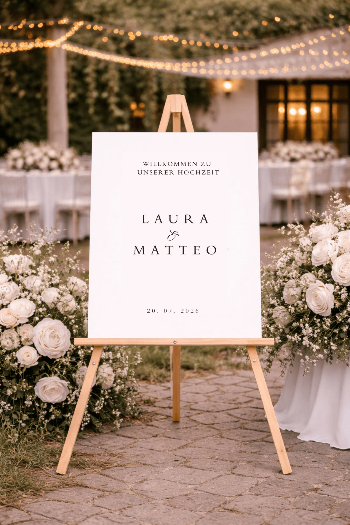 Mit den großzügigen Maßen von 50 x 70 cm ist dein Willkommensschild schon von Weitem gut lesbar und setzt ein echtes Highlight am Eingang deiner Location. Ob auf einer Staffelei, zwischen Blumenarrangements oder am Empfangstisch – dieses Schild heißt deine Gäste stilvoll willkommen.